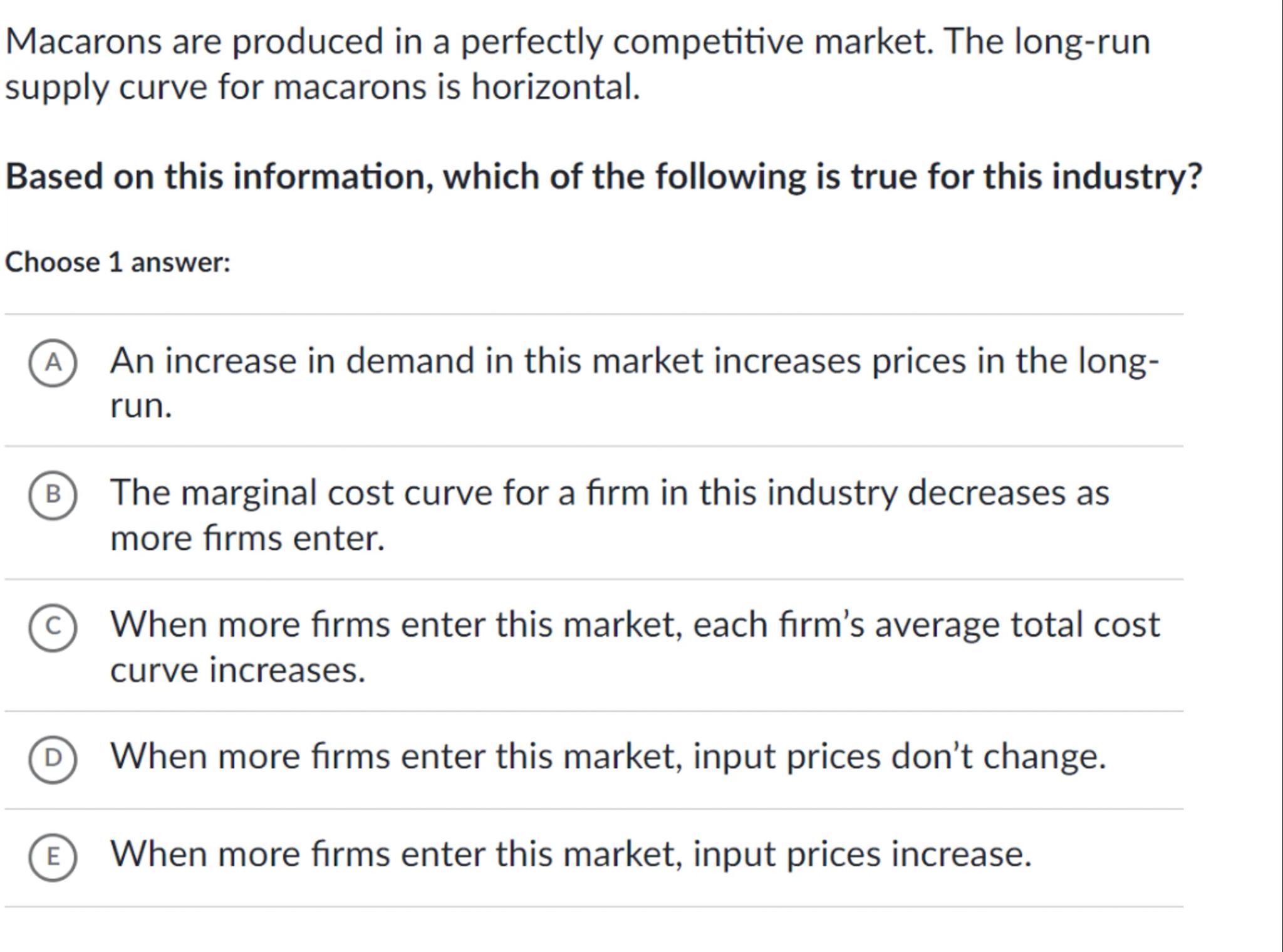 Macarons are produced in a perfectly competitive market. The long-run supply curve for macarons is horizontal.