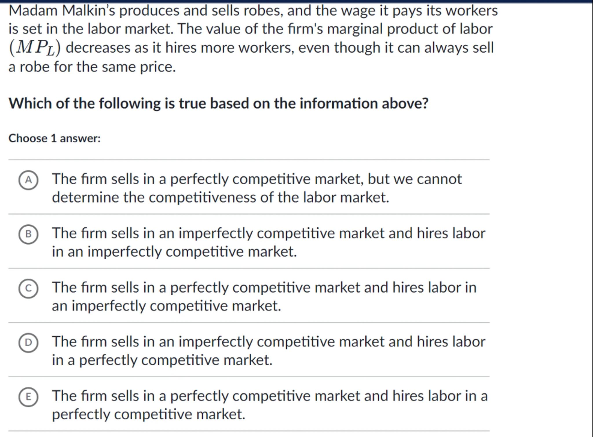 (E) The firm sells in a perfectly competitive market and hires labor in a perfectly competitive market.