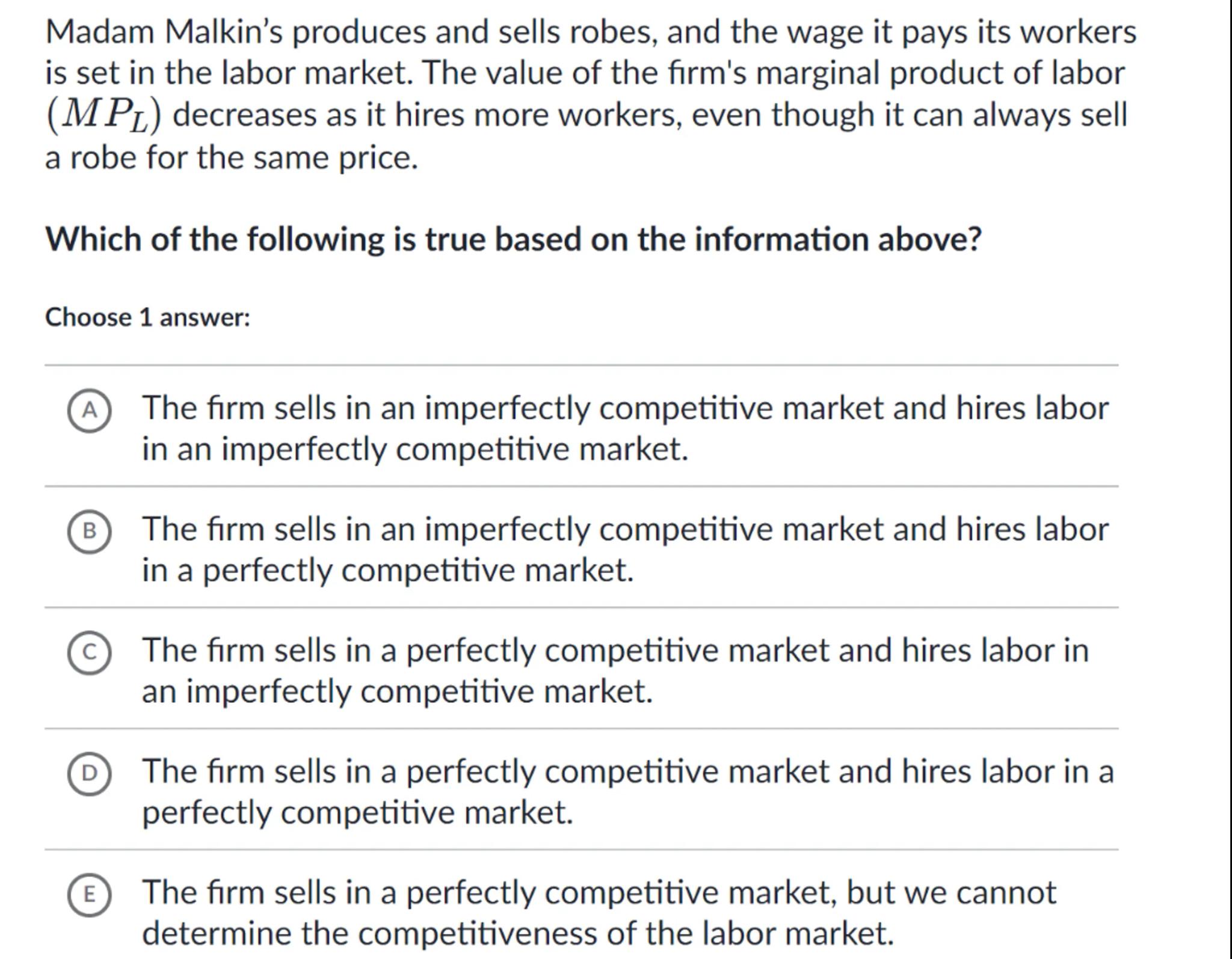 (C) The firm sells in a perfectly competitive market and hires labor in an imperfectly competitive market.