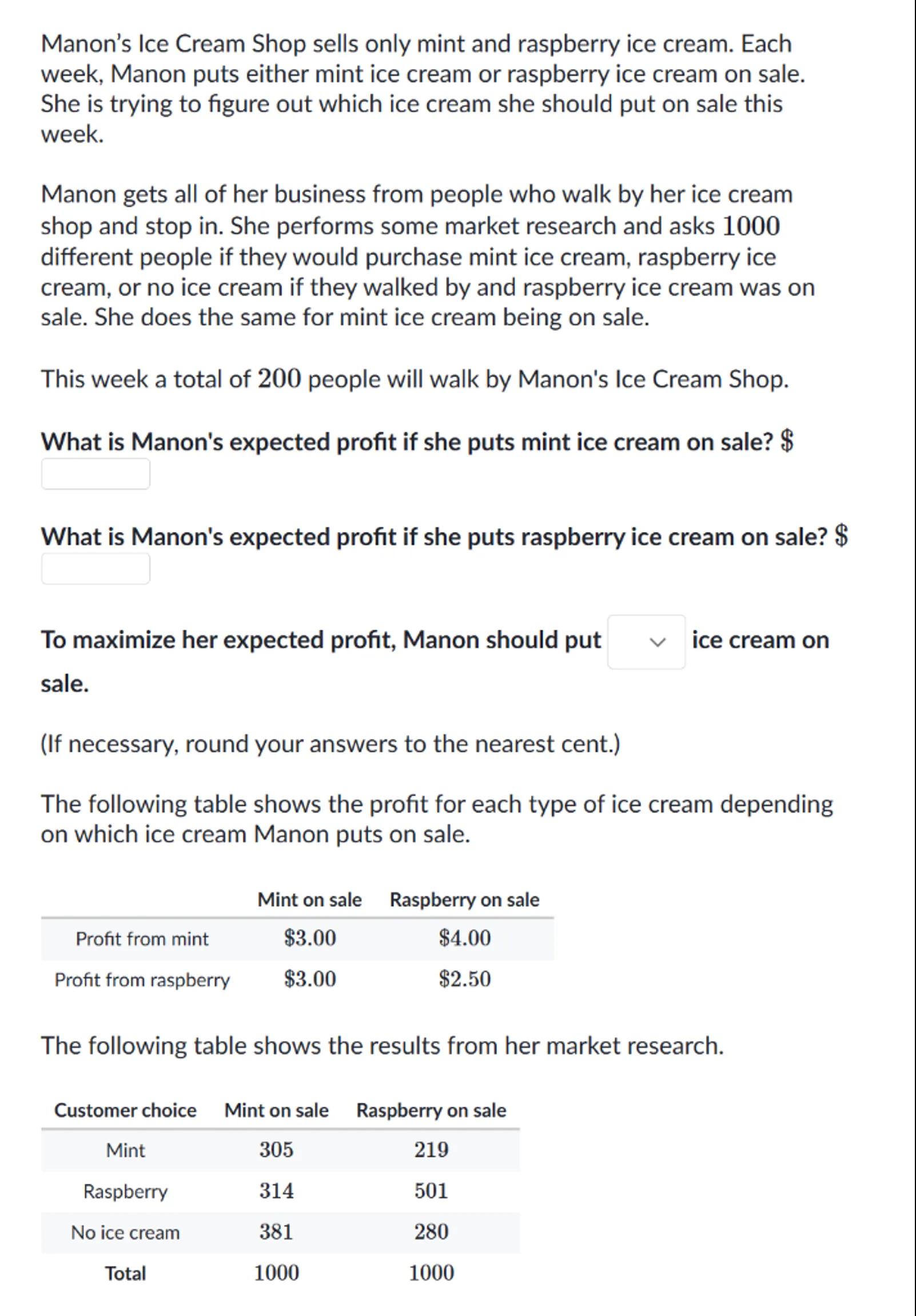 Manon gets all of her business from people who walk by her ice cream shop and stop in. She performs some market research and asks 1000 different people if they would purchase mint ice cream, raspberry ice cream, or no ice cream if they walked by and raspberry ice cream was on sale. She does the same for mint ice cream being on sale.