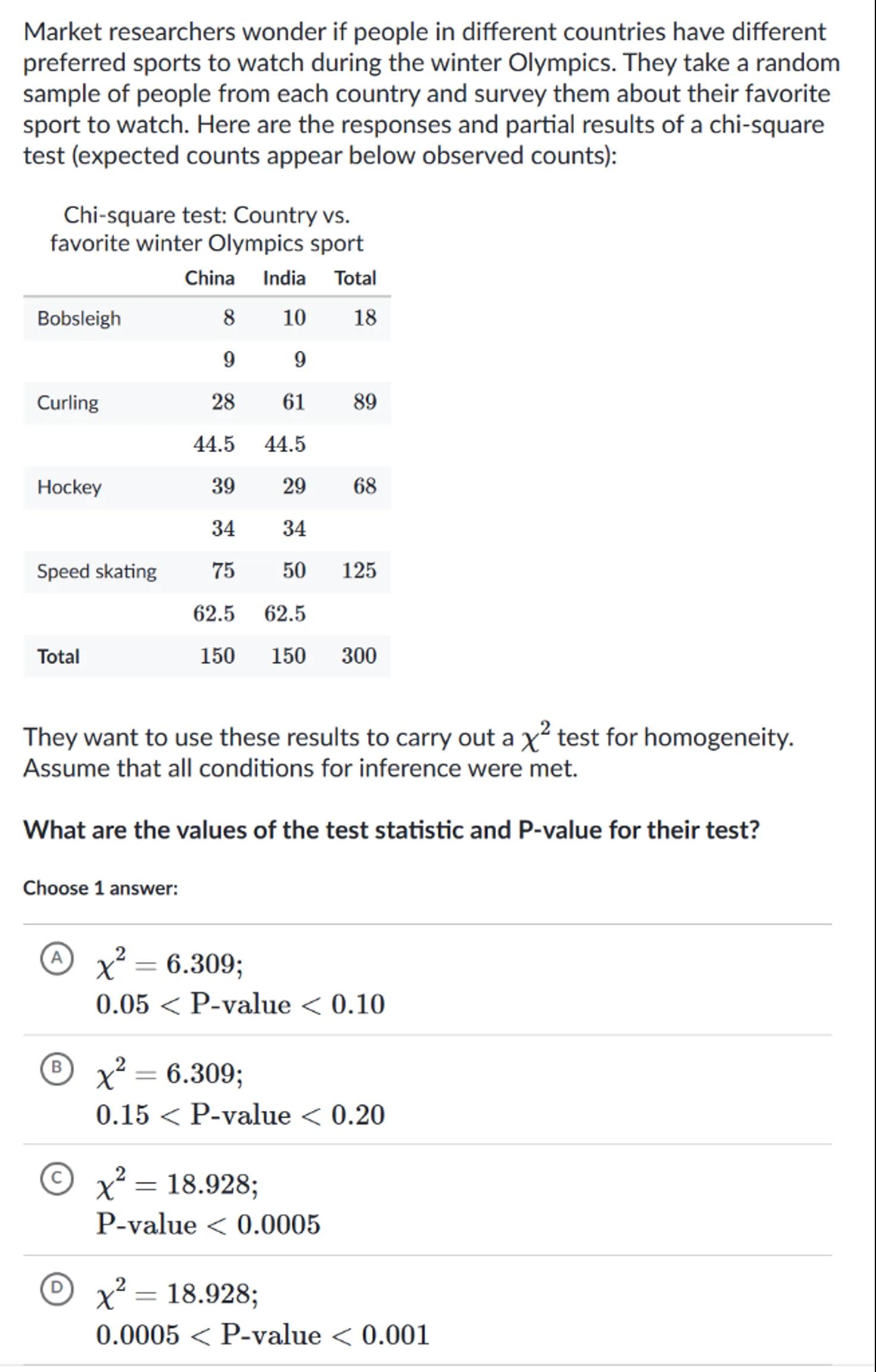 Market researchers wonder if people in different countries have different preferred sports to watch during the winter Olympics. They take a random sample of people from each country and survey them about their favorite sport to watch. Here are the responses and partial results of a chi-square test (expected counts appear below observed counts):