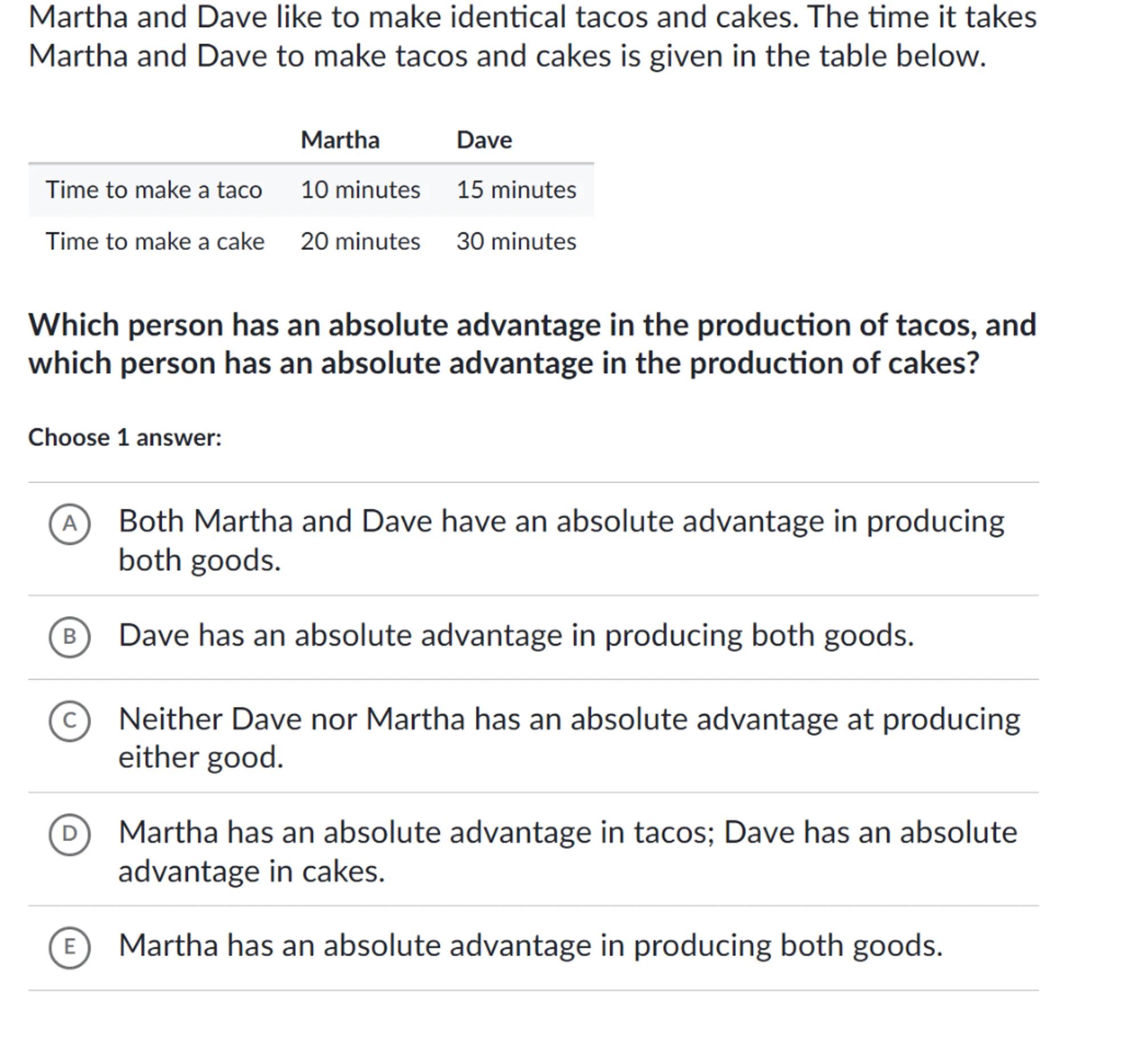 (A) Both Martha and Dave have an absolute advantage in producing both goods.