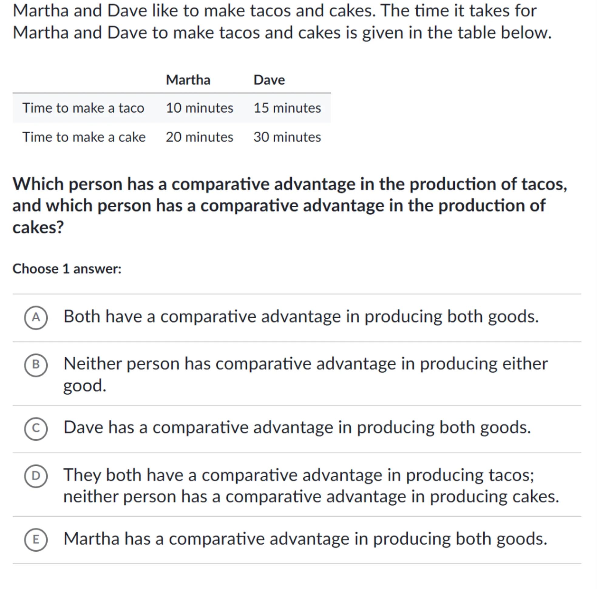(D) They both have a comparative advantage in producing tacos; neither person has a comparative advantage in producing cakes.