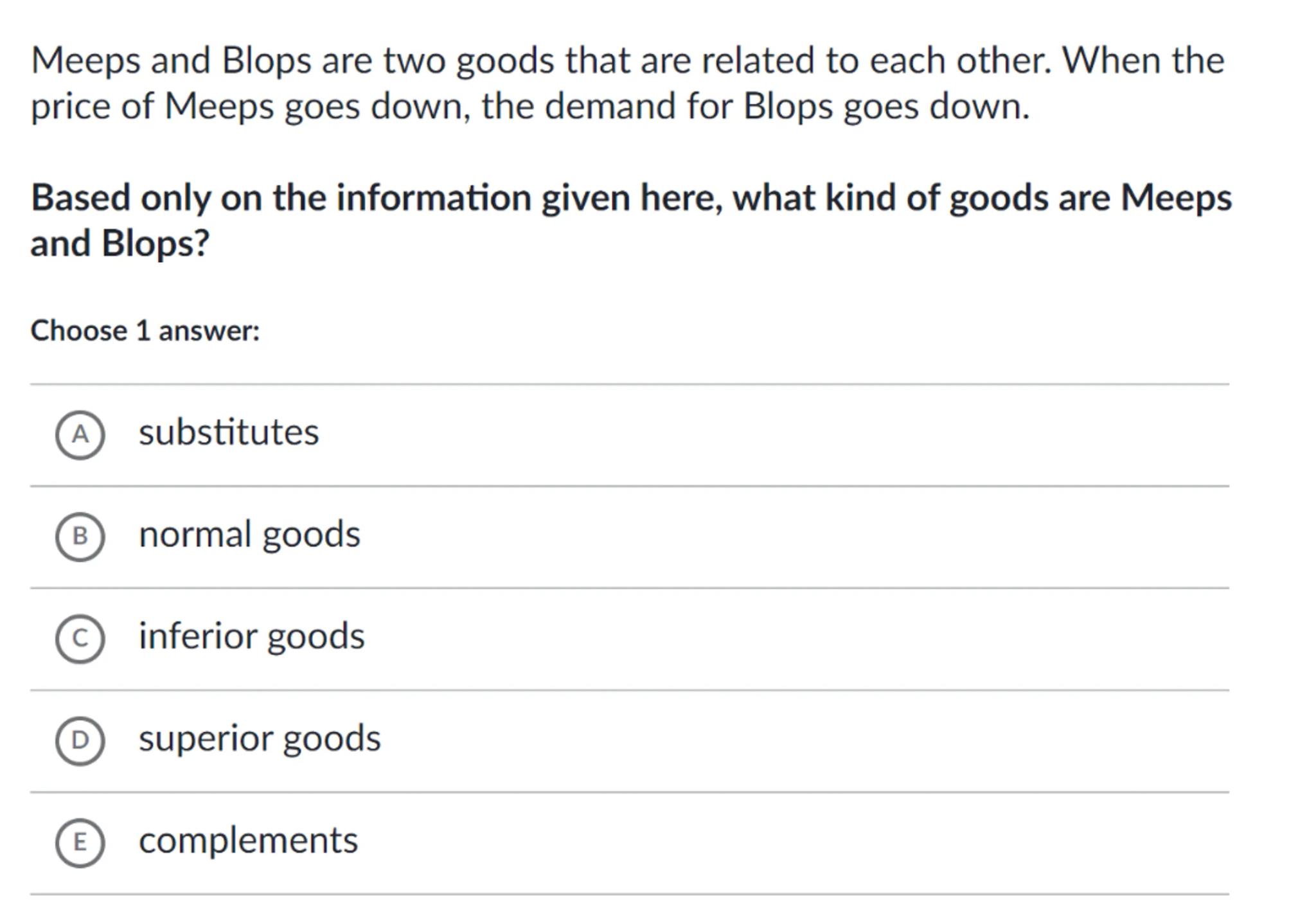 Meeps and Blops are two goods that are related to each other. When the price of Meeps goes down, the demand for Blops goes down.