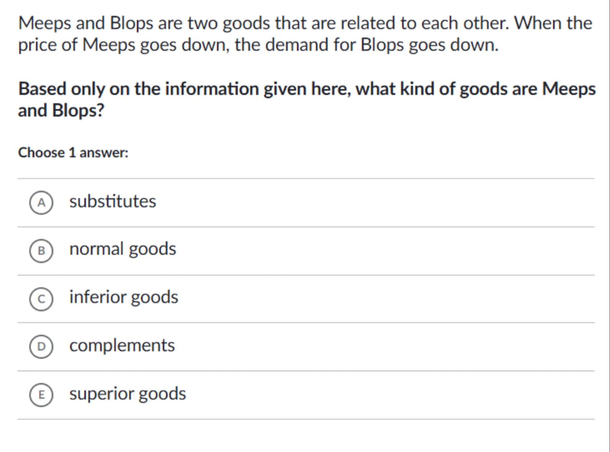 Meeps and Blops are two goods that are related to each other. When the price of Meeps goes down, the demand for Blops goes down.