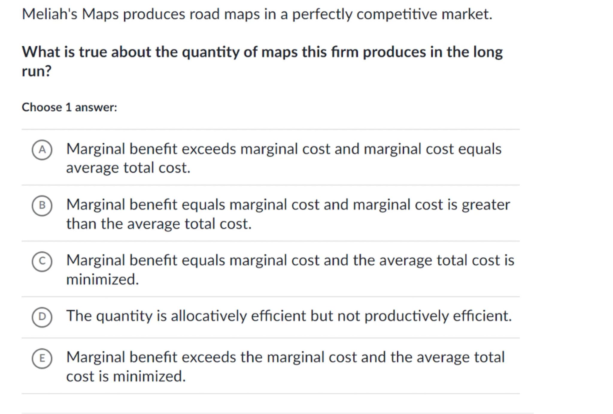 Meliah's Maps produces road maps in a perfectly competitive market.