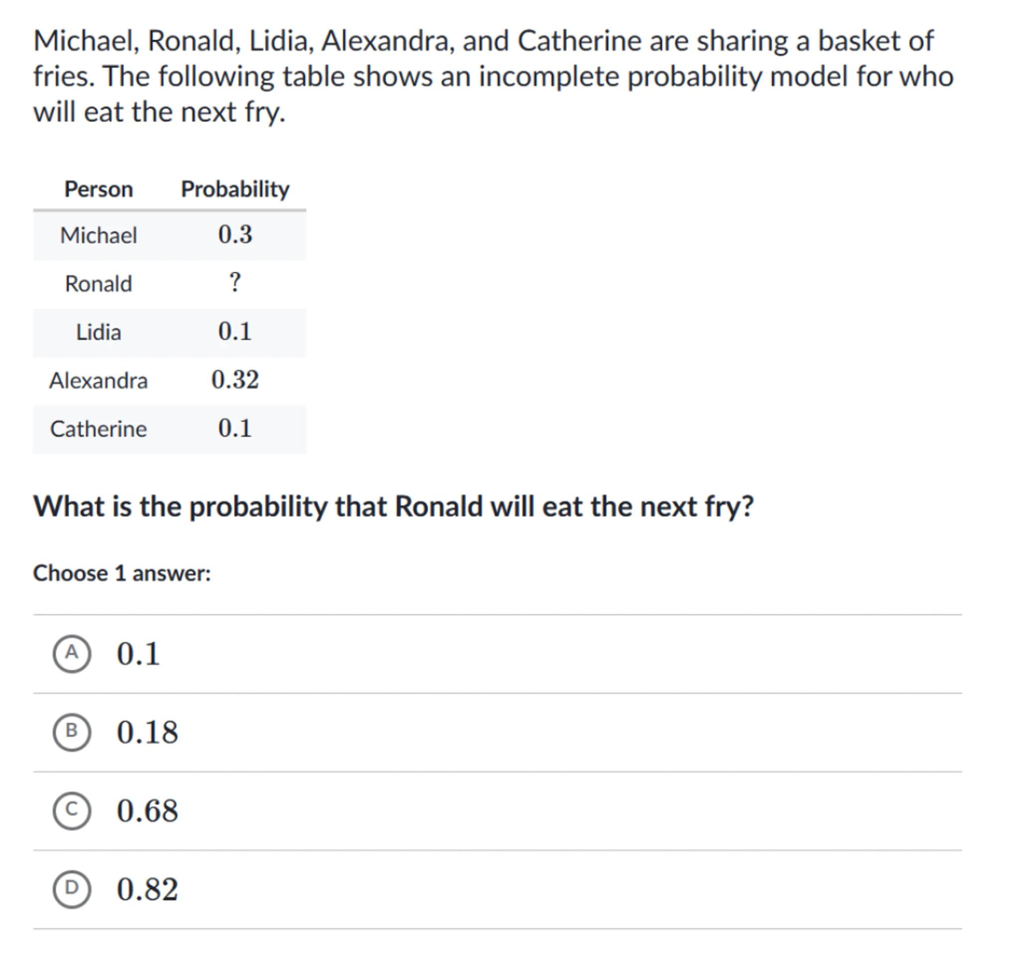 Michael, Ronald, Lidia, Alexandra, and Catherine are sharing a basket of fries. The following table shows an incomplete probability model for who will eat the next fry.