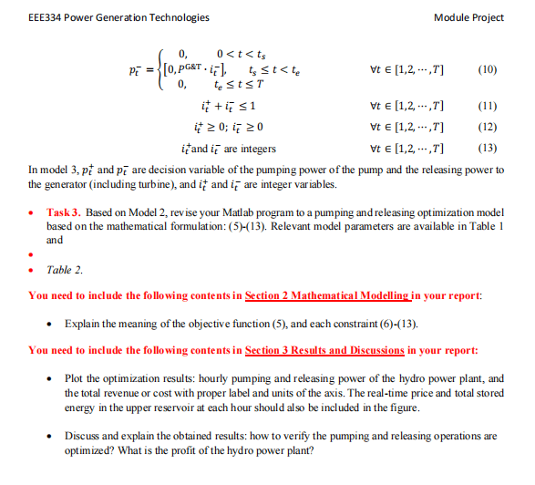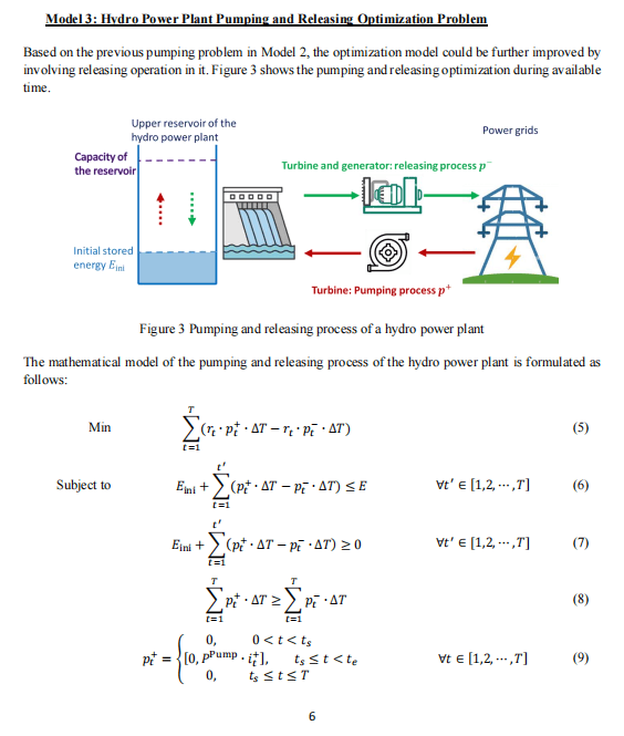 The mathematical model of the pumping and releasing process of the hydro power plant is formulated as