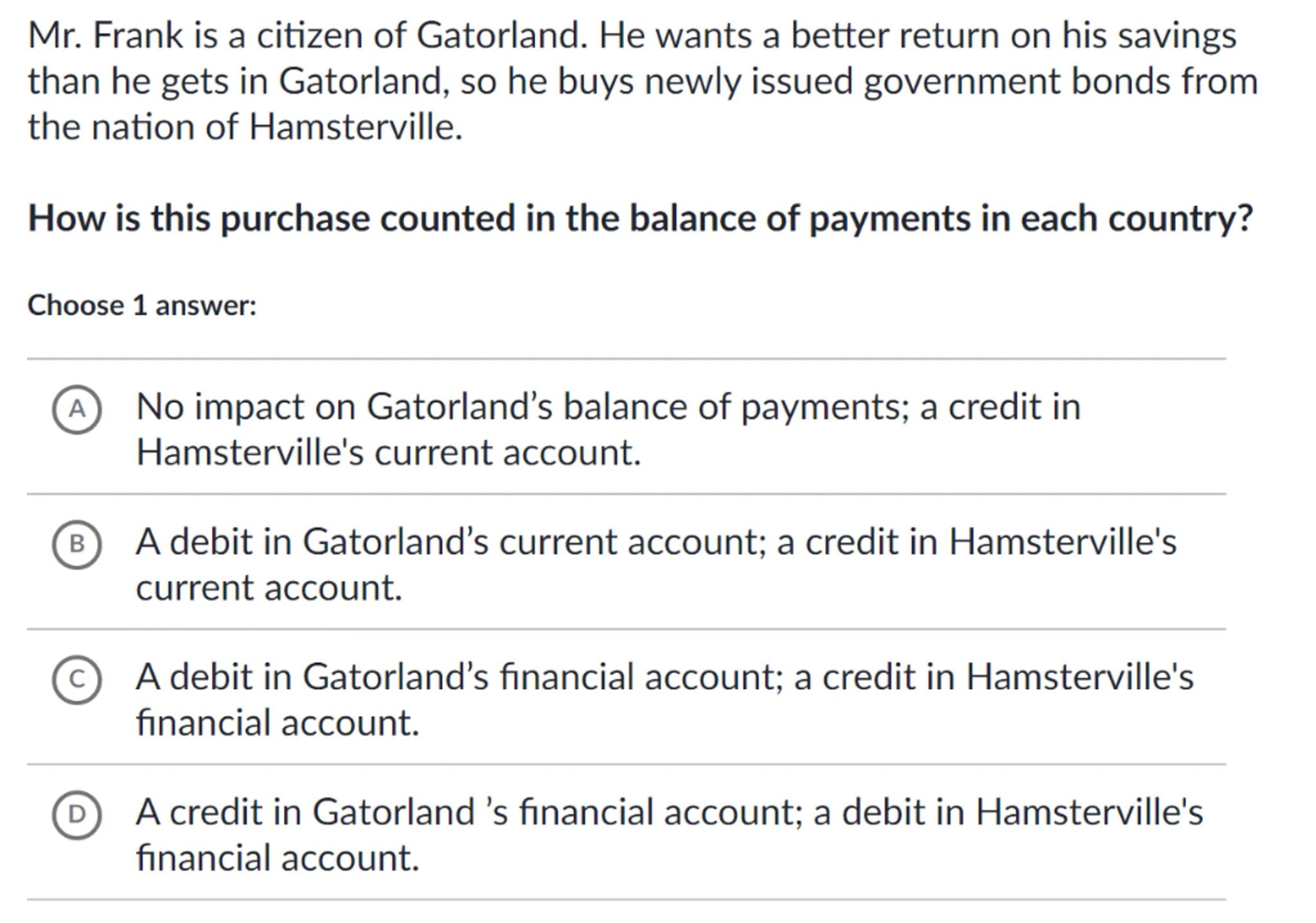 Mr. Frank is a citizen of Gatorland. He wants a better return on his savings than he gets in Gatorland, so he buys newly issued government bonds from the nation of Hamsterville.