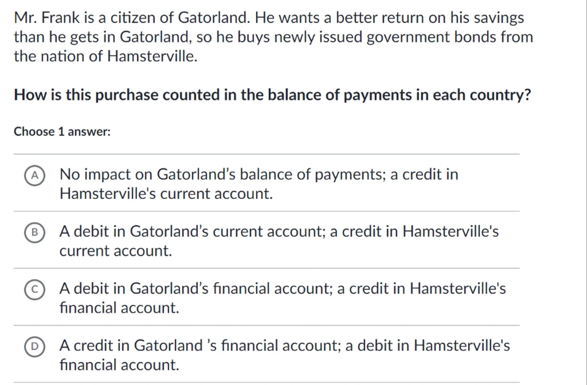 Mr. Frank is a citizen of Gatorland. He wants a better return on his savings than he gets in Gatorland, so he buys newly issued government bonds from the nation of Hamsterville.