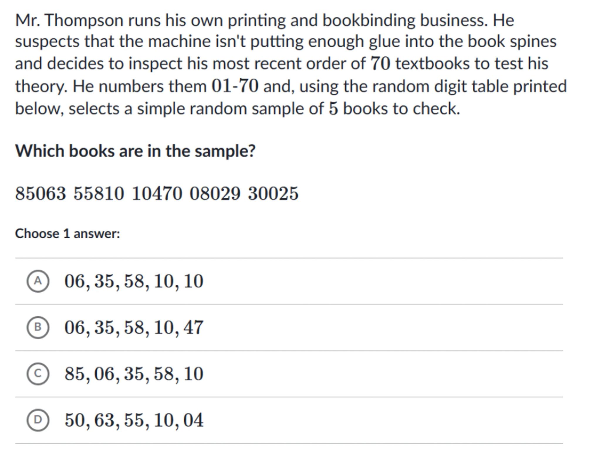 Mr. Thompson runs his own printing and bookbinding business. He suspects that the machine isn't putting enough glue into the book spines and decides to inspect his most recent order of 70 textbooks to test his theory. He numbers them 01-70 and, using the random digit table printed below, selects a simple random sample of 5 books to check.