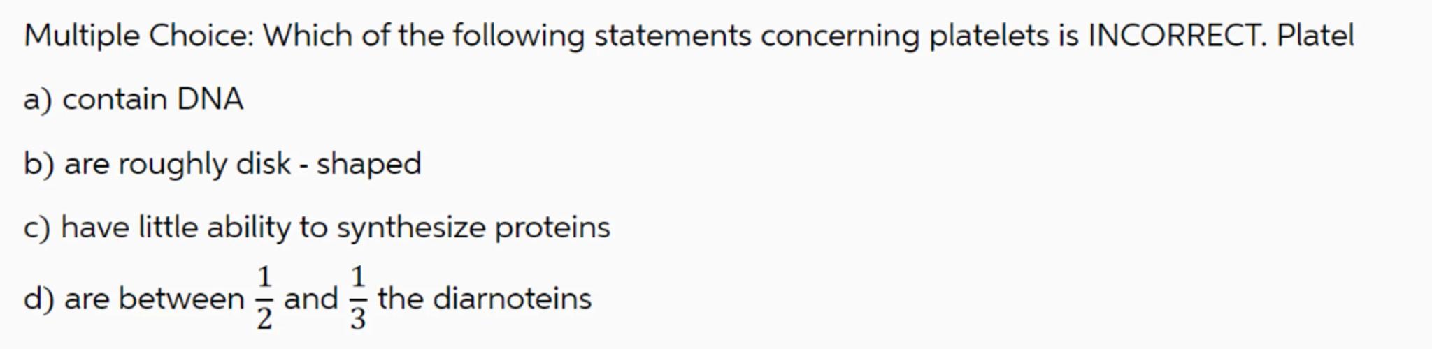 Multiple Choice: Which of the following statements concerning platelets is INCORRECT. Platel