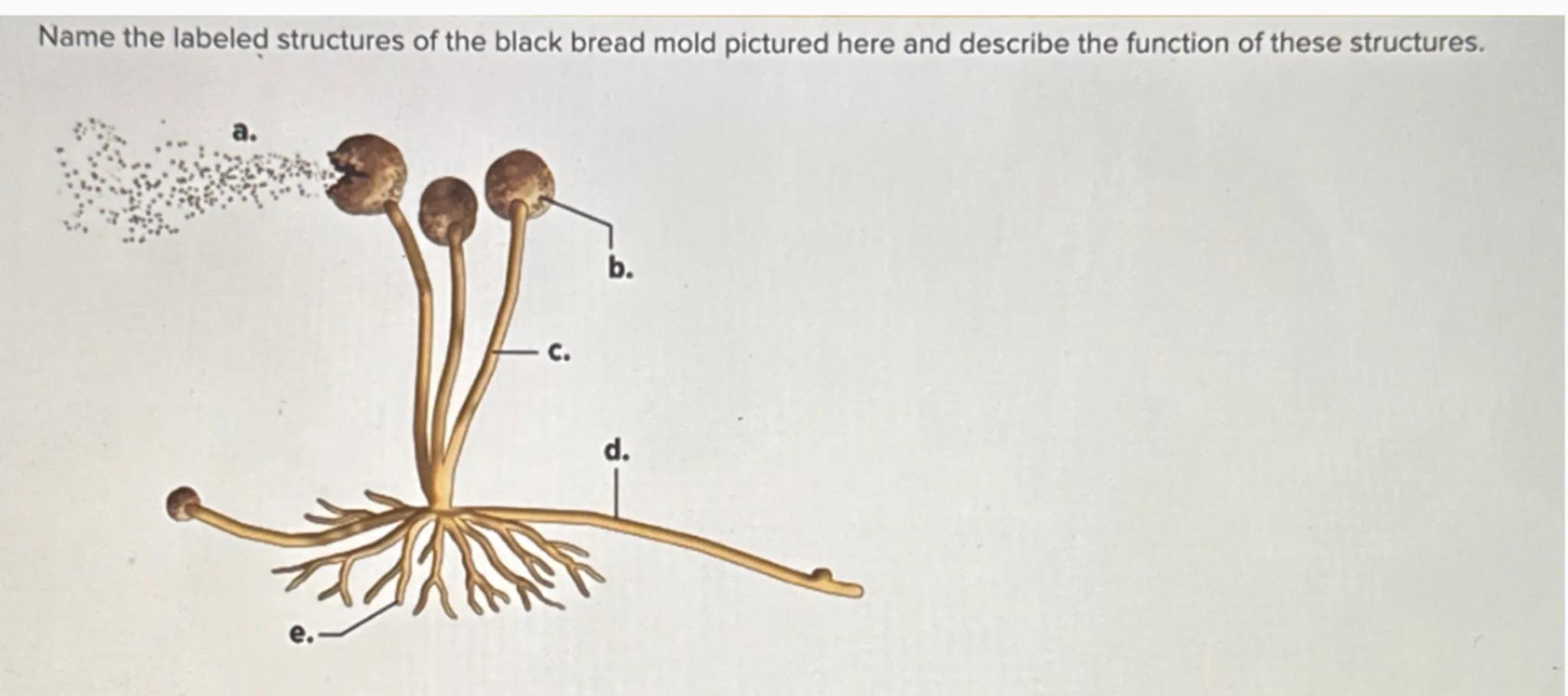 Name the labeled structures of the black bread mold pictured here and describe the function of these structures.