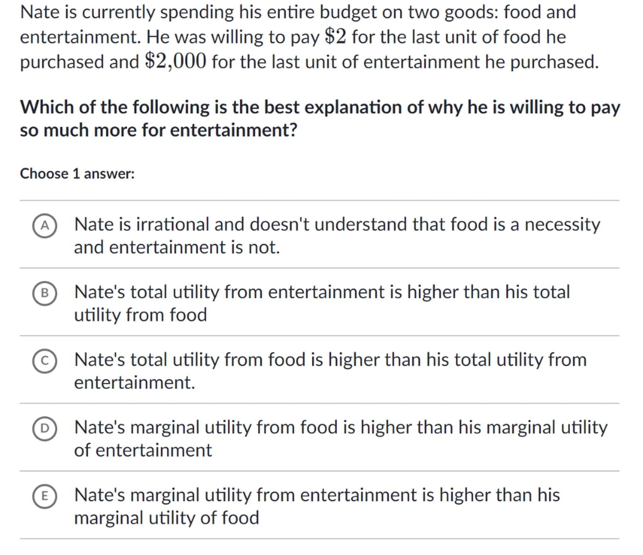 (A) Nate is irrational and doesn't understand that food is a necessity and entertainment is not.