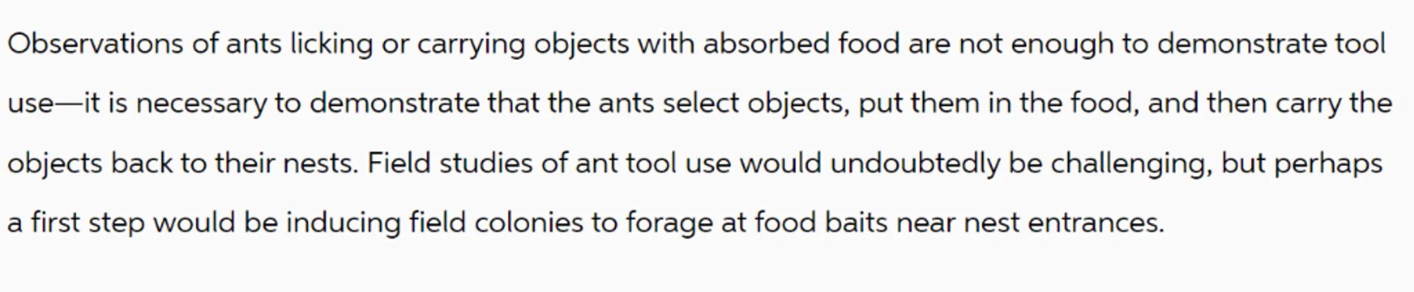 Observations of ants licking or carrying objects with absorbed food are not enough to demonstrate tool use-it is necessary to demonstrate that the ants select objects, put them in the food, and then carry the objects back to their nests. Field studies of ant tool use would undoubtedly be challenging, but perhaps a first step would be inducing field colonies to forage at food baits near nest entrances.