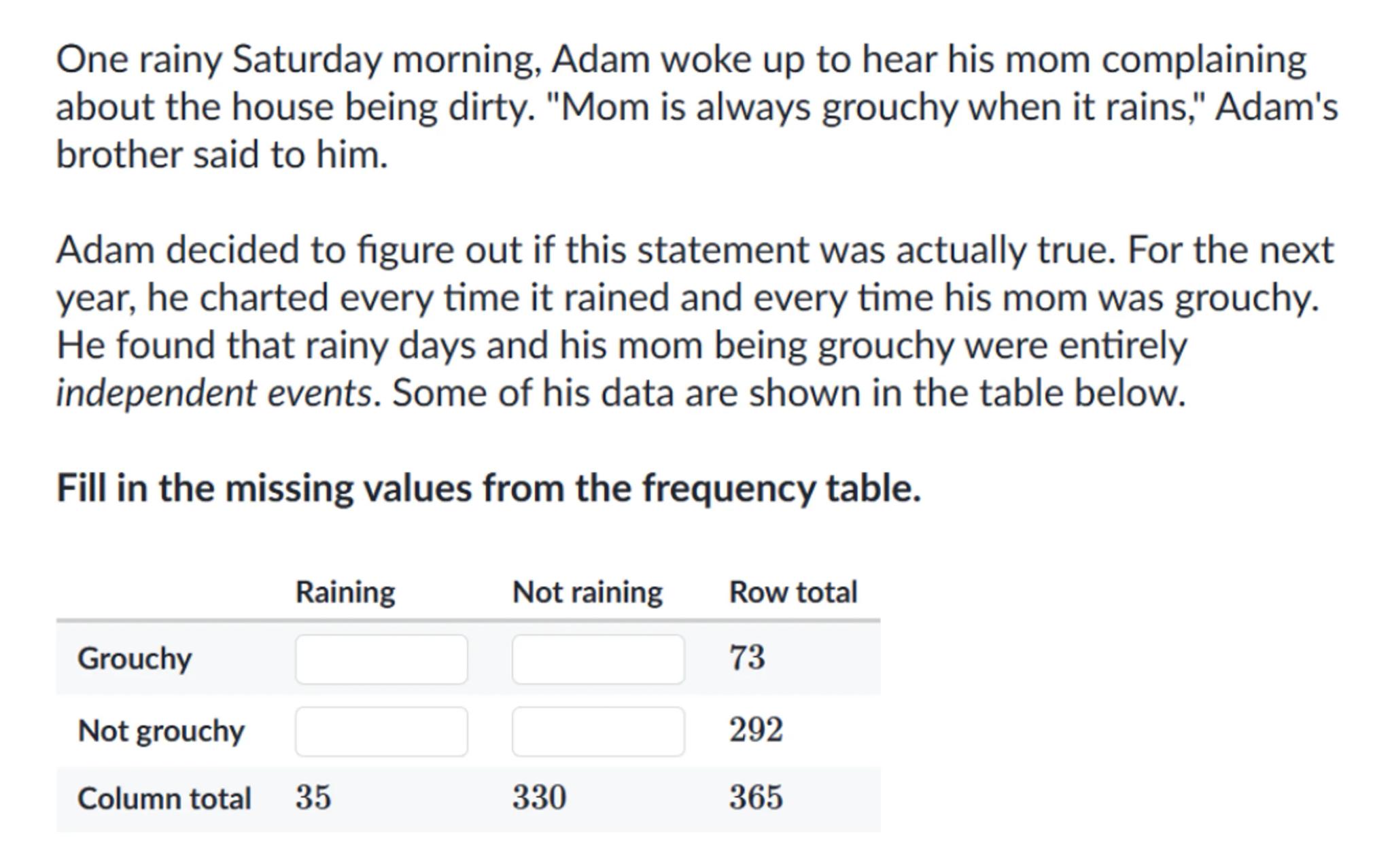 Adam decided to figure out if this statement was actually true. For the next year, he charted every time it rained and every time his mom was grouchy. He found that rainy days and his mom being grouchy were entirely independent events. Some of his data are shown in the table below.
