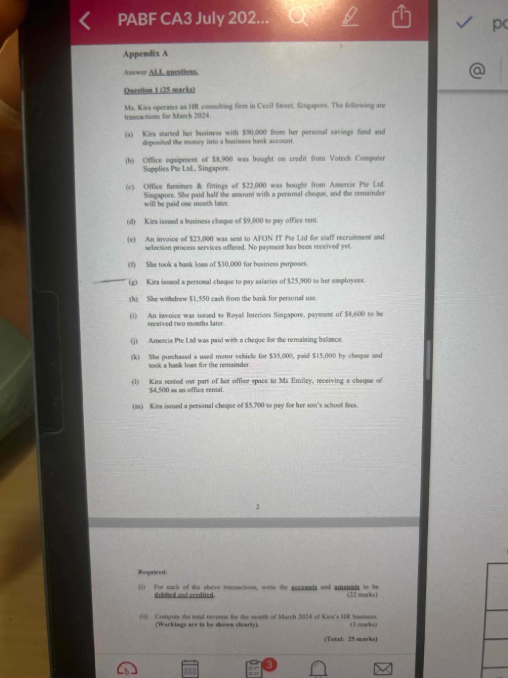 Ms. Kirn operates an IIR consulting firm in Cecil Street, Singapore. The following are transactions for March 2024.