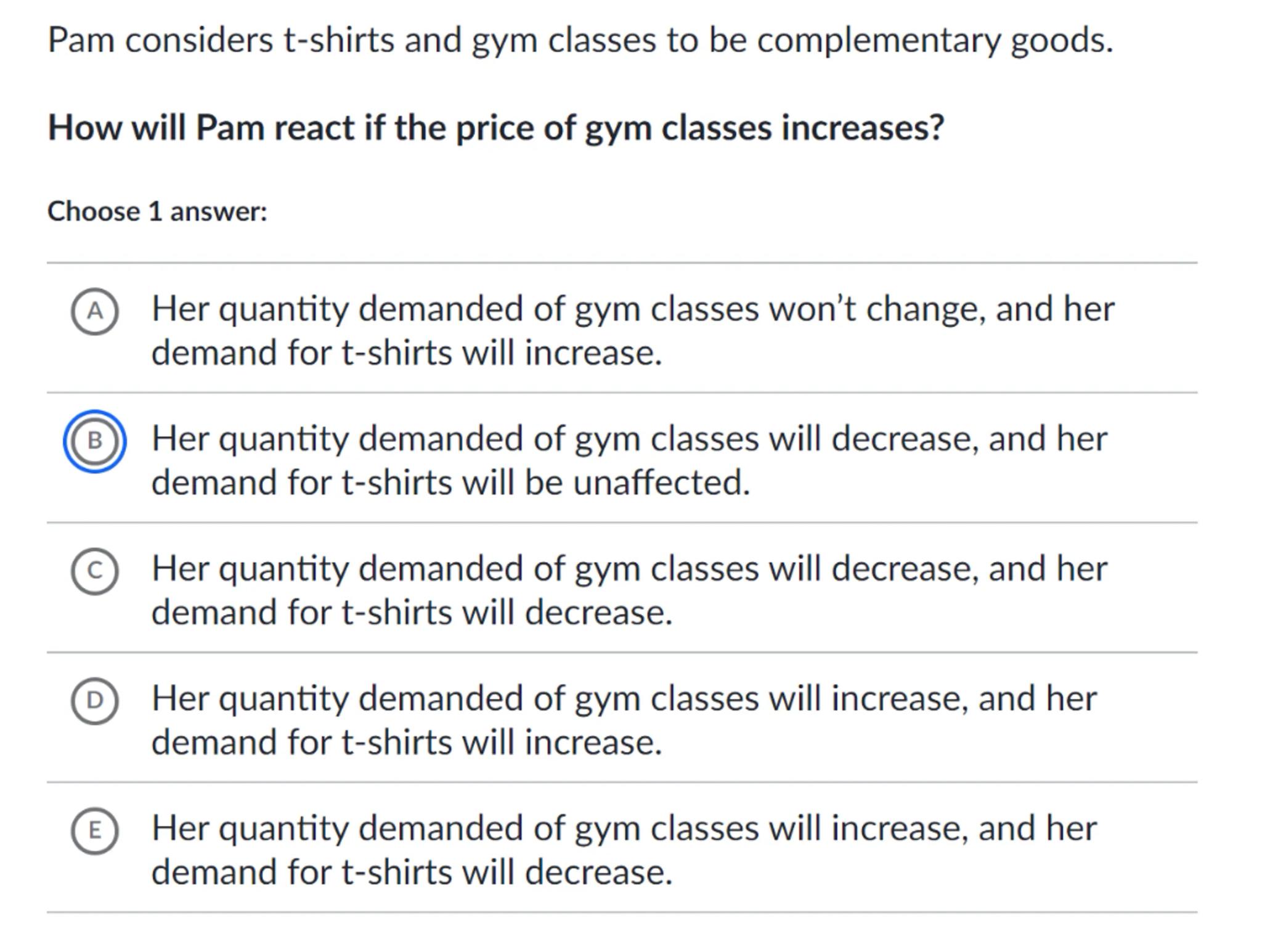 (B) Her quantity demanded of gym classes will decrease, and her demand for -shirts will be unaffected.