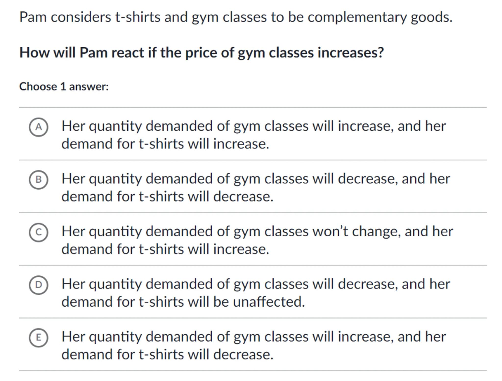 (B) Her quantity demanded of gym classes will decrease, and her demand for t-shirts will decrease.