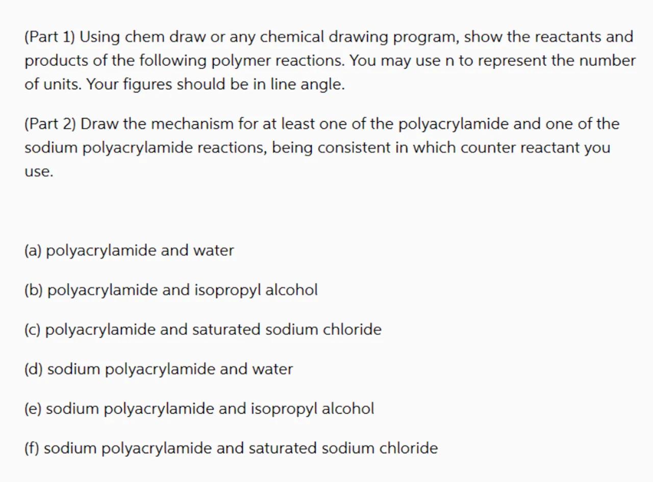 (Part 2) Draw the mechanism for at least one of the polyacrylamide and one of the sodium polyacrylamide reactions, being consistent in which counter reactant you use.