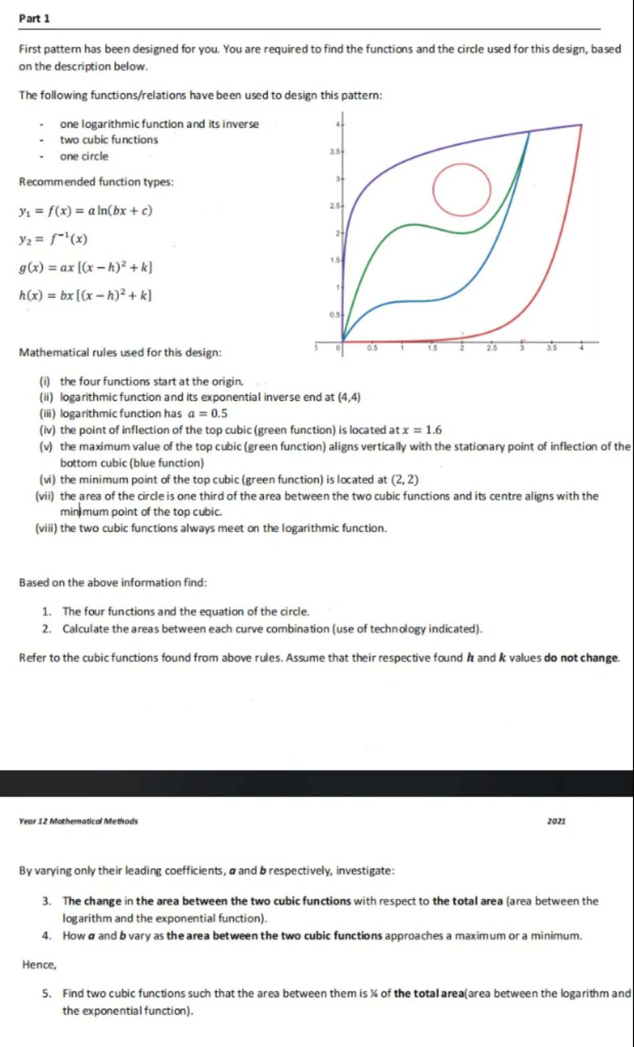 (vii) the area of the circle is one third of the area between the two cubic functions and its centre aligns with the minimum point of the top cubic.