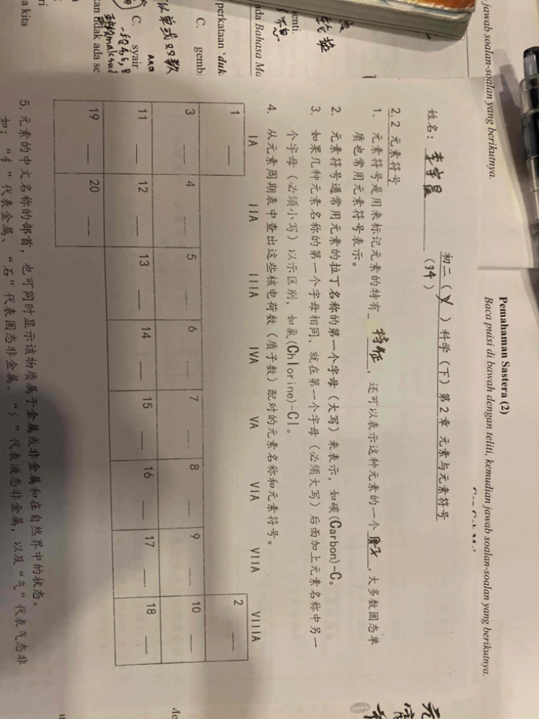 2. 元素符号通常用元素的拉丁名称的第一个宇母(大写)来表示,如碳(Carbon)-C。