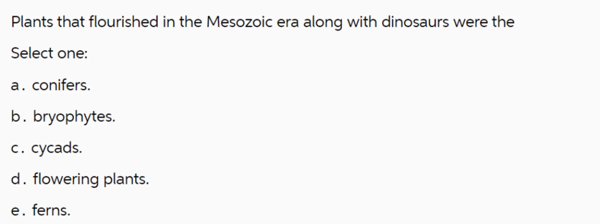 Plants that flourished in the Mesozoic era along with dinosaurs were the