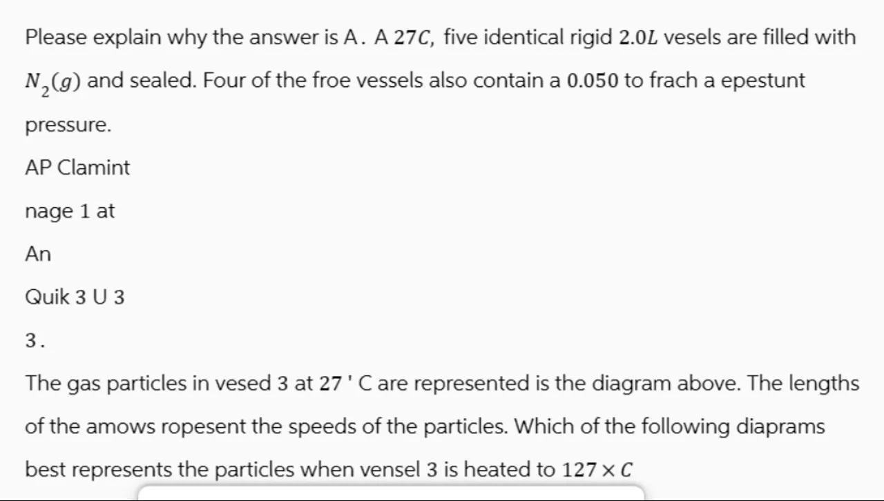 The gas particles in vesed 3 at are represented is the diagram above. The lengths of the amows ropesent the speeds of the particles. Which of the following diaprams best represents the particles when vensel 3 is heated to