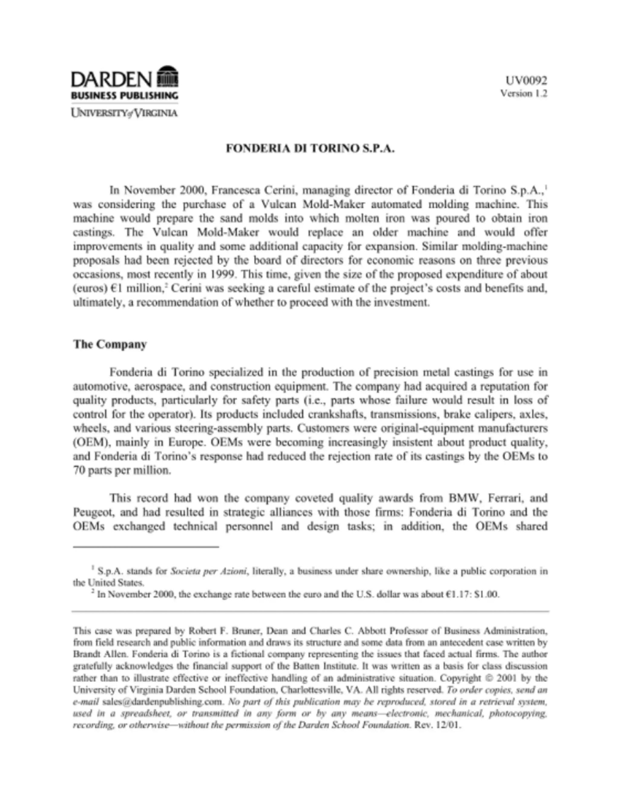 This case was prepared by Robert F. Bruner, Dean and Charles C. Abbott Professor of Business Administration, from field research and public information and draws its structure and some data from an antecedent case written by Brandt Allen. Fonderia di Torino is a fictional company representing the issues that faced actual firms. The author gratefully acknowledges the financial support of the Batten Institute. It was written as a basis for class discussion rather than to illustrate effective of ineffective handling of an administrative situation. Copyright by the University of Virginia Darden School Foundation, Charlottesville, VA. All rights reserved. To onder copies, send an e-mail sales@dardenpublishing, com. No part of this publication may be reproduced, stored in a retrieval system, used in a spreadsheet, or tranamitted in any form or by any means-electronic, mechanical, photocopying. recording, or othervise-without the penmission of the Darden School Foundation. Rev. 12.01.