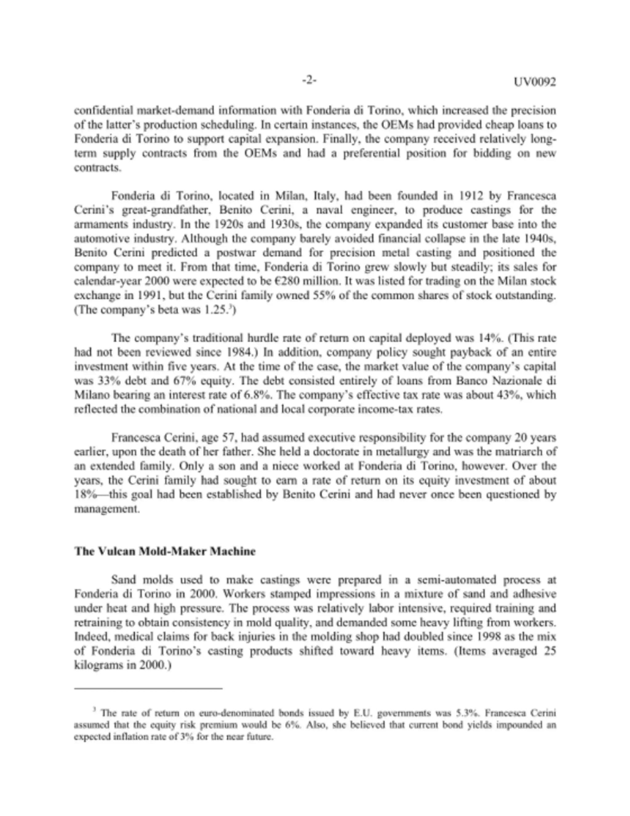 Francesca Cerini, age 57, had assumed executive responsibility for the company 20 years earlier, upon the death of her father. She held a doctorate in metallurgy and was the matriarch of an extended family. Only a son and a niece worked at Fonderia di Torino, however. Over the years, the Cerini family had sought to earn a rate of return on its equity investment of about -this goal had been established by Benito Cerini and had never once been questioned by management.