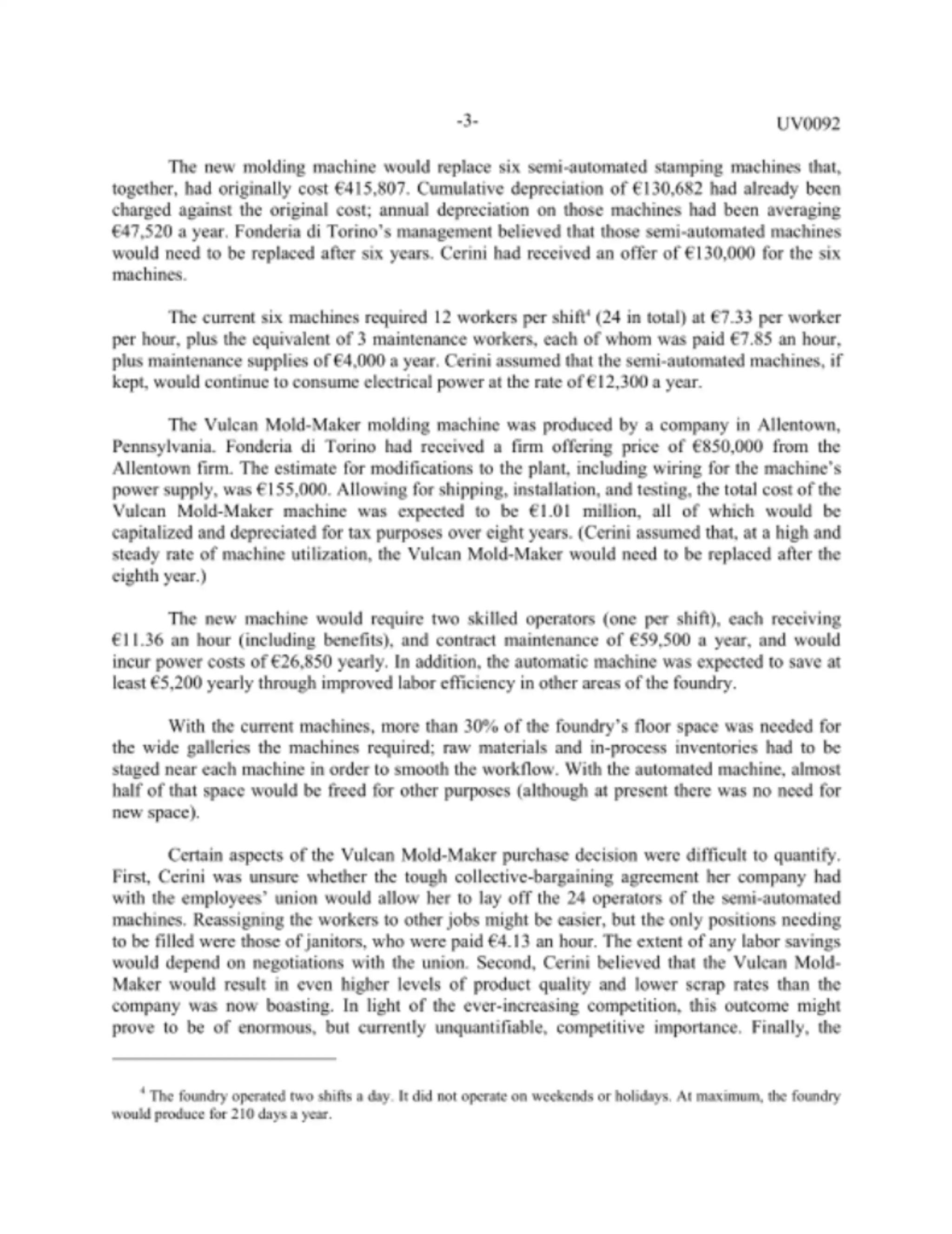 In November 2000, Francesca Cerini, managing director of Fonderia di Torino S.p.A., was considering the purchase of a Vulcan Mold-Maker automated molding machine. This machine would prepare the sand molds into which molten iron was poured to obtain iron castings. The Vulcan Mold-Maker would replace an older machine and would offer improvements in quality and some additional capacity for expansion. Similar molding-machine proposals had been rejected by the board of directors for economic reasons on three previous occasions, most recently in 1999. This time, given the size of the proposed expenditure of about (euros) million, Cerini was seeking a careful estimate of the project's costs and benefits and, ultimately, a recommendation of whether to proceed with the investment.
