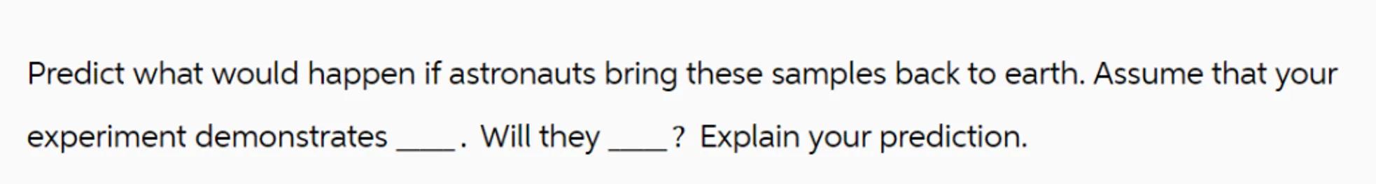 Predict what would happen if astronauts bring these samples back to earth. Assume that your experiment demonstrates . Will they ? Explain your prediction.