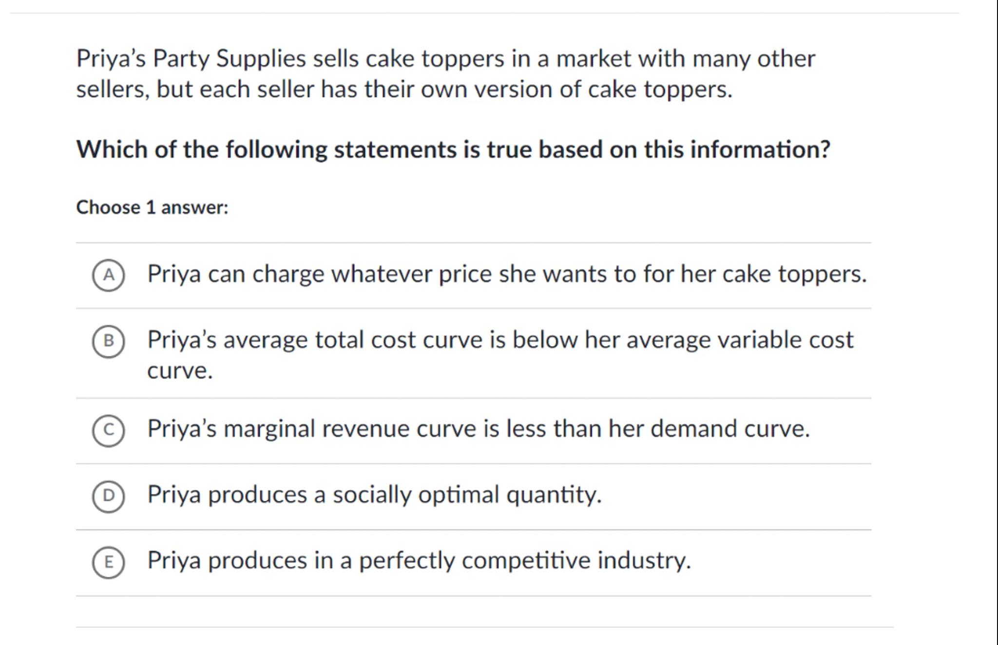 Priya's Party Supplies sells cake toppers in a market with many other sellers, but each seller has their own version of cake toppers.