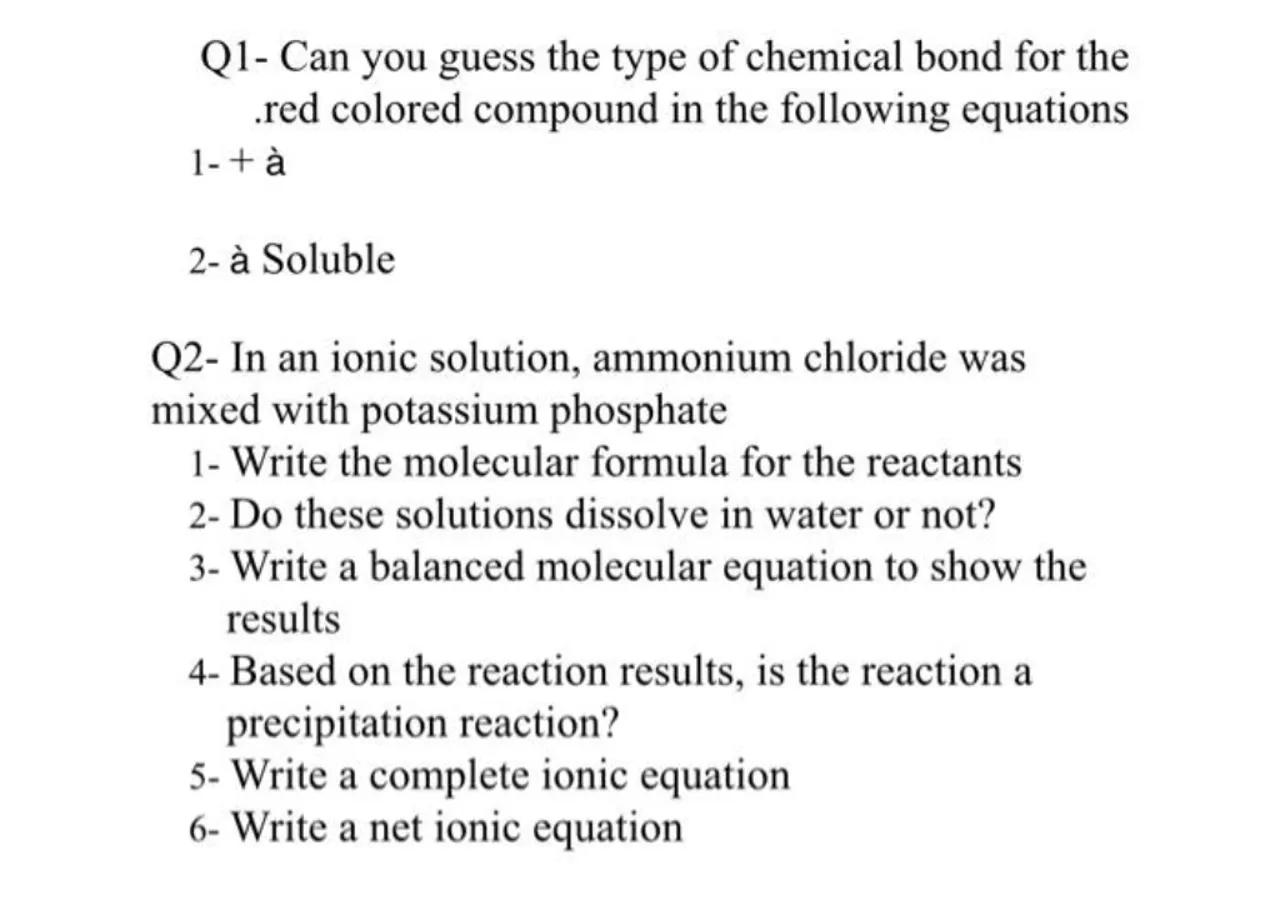 Q1- Can you guess the type of chemical bond for the .red colored compound in the following equations