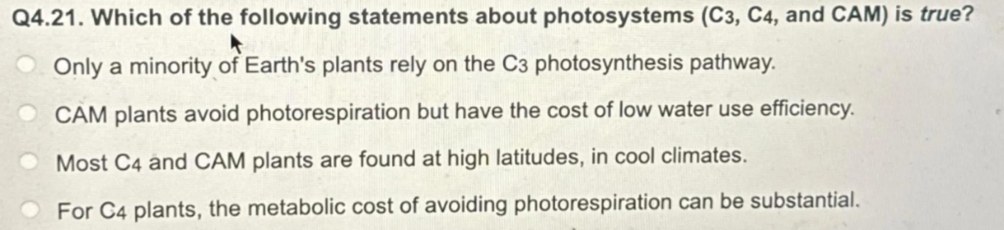 Q4.21. Which of the following statements about photosystems , and CAM) is true?