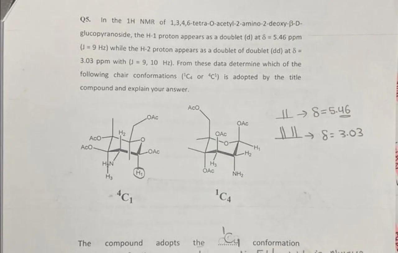 Q5. In the 1H NMR of 1,3,4,6-tetra-O-acetyl-2-amino-2-deoxy- -Dglucopyranoside, the proton appears as a doublet (d) at ( ) while the proton appears as a doublet of doublet (dd) at with . From these data determine which of the following chair conformations or is adopted by the title compound and explain your answer.