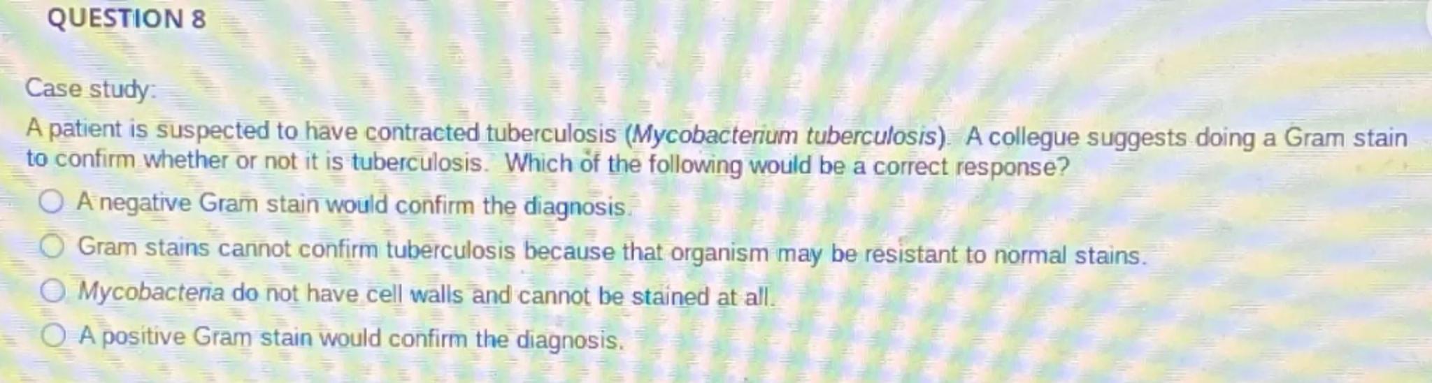 A patient is suspected to have contracted tuberculosis (Mycobacterium tuberculosis). A collegue suggests doing a Gram stain to confirm whether or not it is tuberculosis. Which of the following would be a correct response?