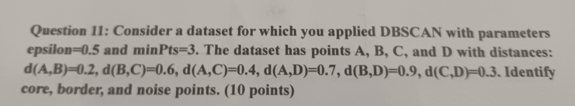 Question 11: Consider a dataset for which you applied DBSCAN with parameters