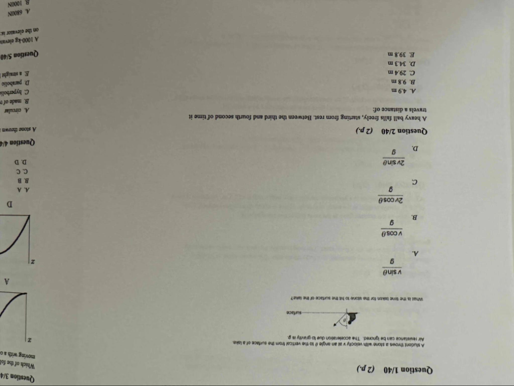 A student throws a stone with velocity at an angle to the vertical from the surface of a lake Air Iesistance can be ignored. The acceleration due to grovity is .