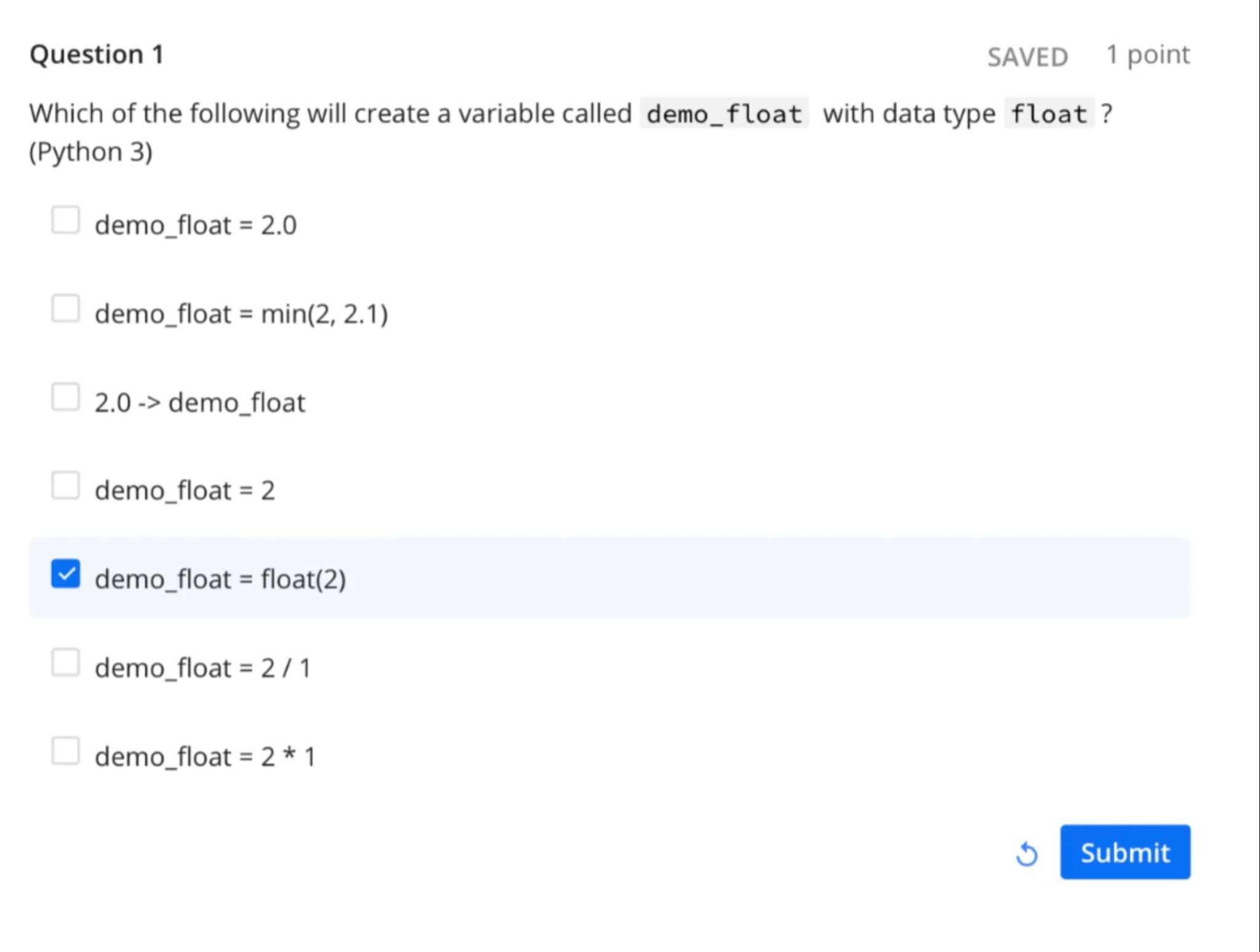 Hi Hanhe! It looks like you're working on a question related to Python and data types. The question asks which of the provided options will create a variable called "demo_float" with the data type float in Python 3.