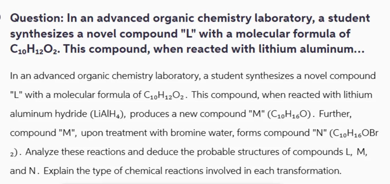 Question: In an advanced organic chemistry laboratory, a student synthesizes a novel compound " " with a molecular formula of . This compound, when reacted with lithium aluminum...