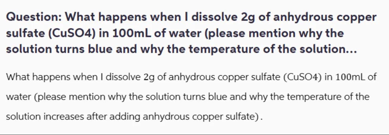 Question: What happens when I dissolve of anhydrous copper sulfate (CuSO4) in of water (please mention why the solution turns blue and why the temperature of the solution...