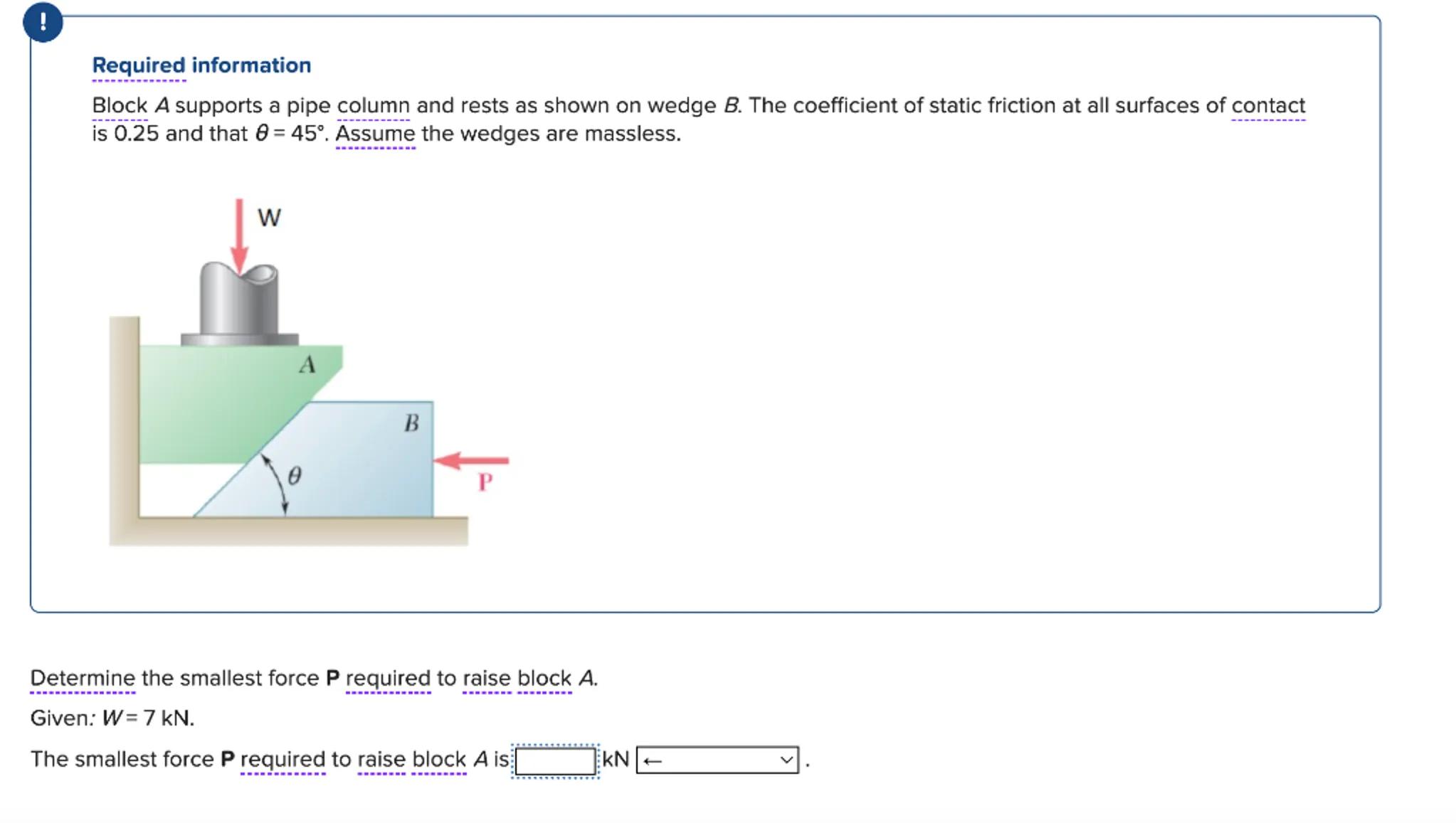 Block supports a pipe column and rests as shown on wedge . The coefficient of static friction at all surfaces of contact is 0.25 and that . Assume the wedges are massless.