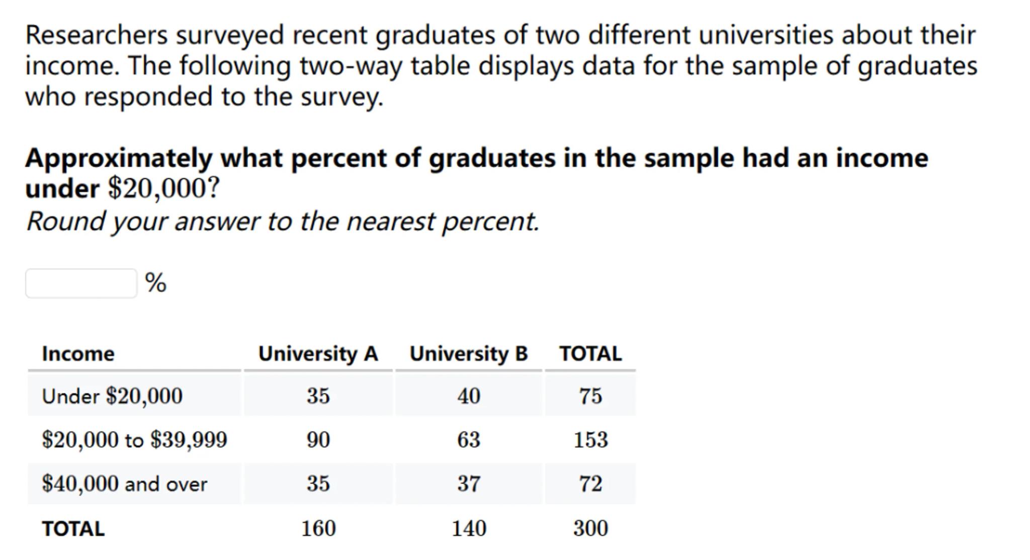 Researchers surveyed recent graduates of two different universities about their income. The following two-way table displays data for the sample of graduates who responded to the survey.