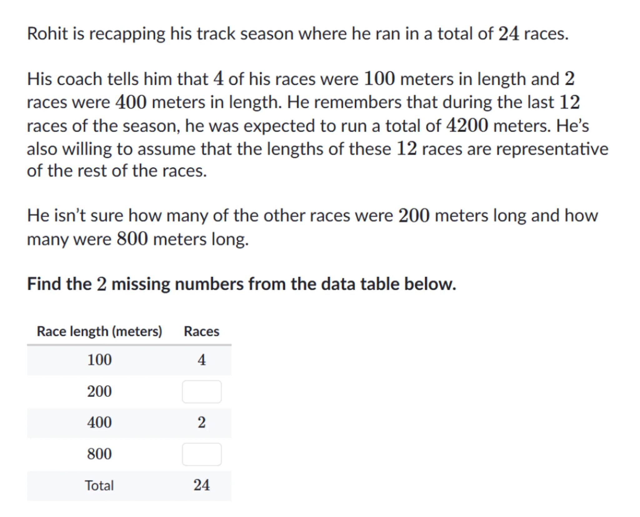 His coach tells him that 4 of his races were 100 meters in length and 2 races were 400 meters in length. He remembers that during the last 12 races of the season, he was expected to run a total of 4200 meters. He's also willing to assume that the lengths of these 12 races are representative of the rest of the races.
