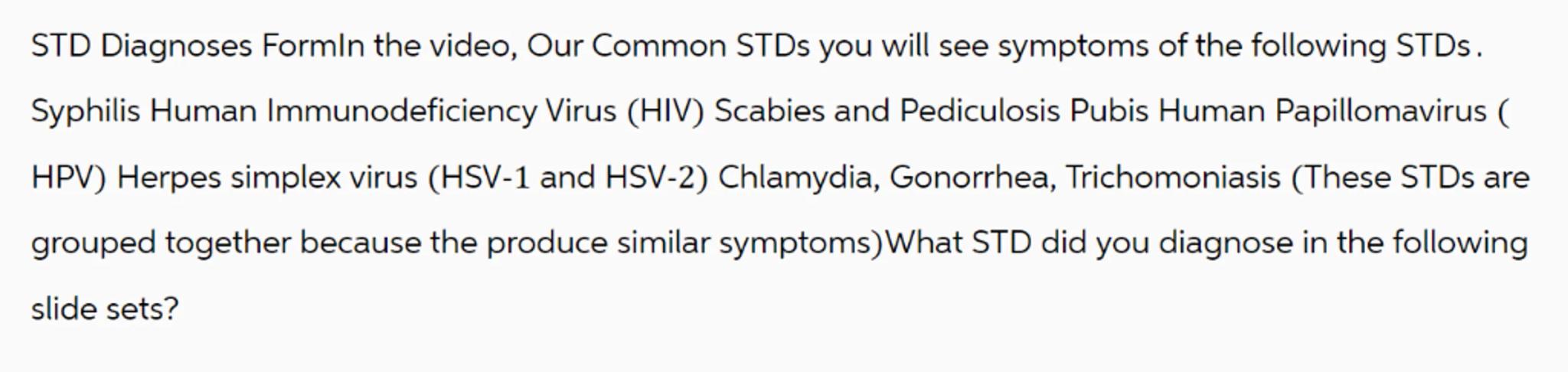 STD Diagnoses Formln the video, Our Common STDs you will see symptoms of the following STDs. Syphilis Human Immunodeficiency Virus (HIV) Scabies and Pediculosis Pubis Human Papillomavirus ( HPV) Herpes simplex virus (HSV-1 and HSV-2) Chlamydia, Gonorrhea, Trichomoniasis (These STDs are grouped together because the produce similar symptoms)What STD did you diagnose in the following slide sets?