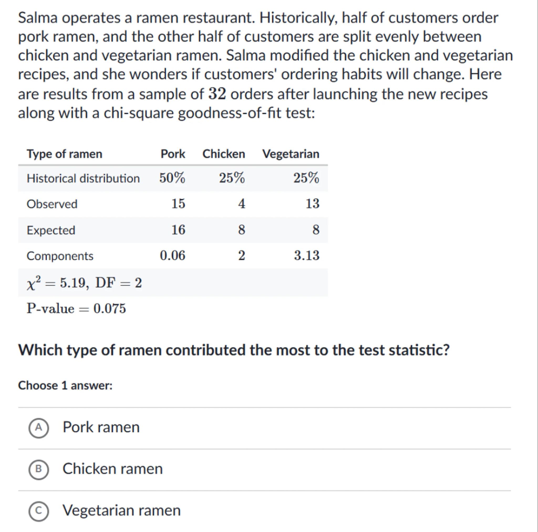 Salma operates a ramen restaurant. Historically, half of customers order pork ramen, and the other half of customers are split evenly between chicken and vegetarian ramen. Salma modified the chicken and vegetarian recipes, and she wonders if customers' ordering habits will change. Here are results from a sample of 32 orders after launching the new recipes along with a chi-square goodness-of-fit test: