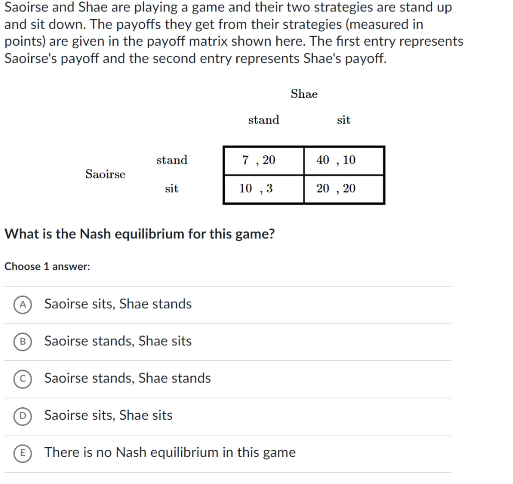 Saoirse and Shae are playing a game and their two strategies are stand up and sit down. The payoffs they get from their strategies (measured in points) are given in the payoff matrix shown here. The first entry represents Saoirse's payoff and the second entry represents Shae's payoff.
