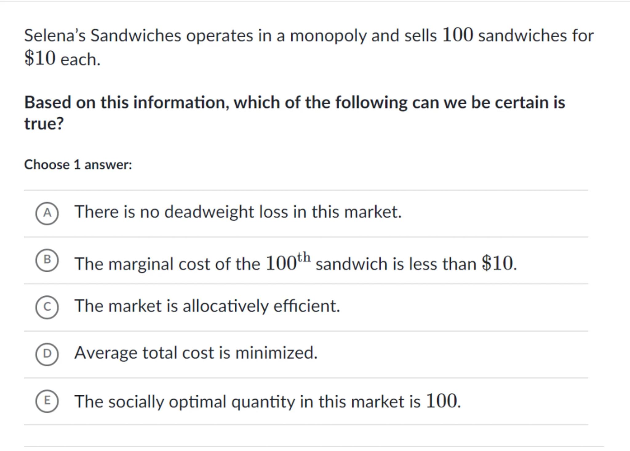Selena's Sandwiches operates in a monopoly and sells 100 sandwiches for each.