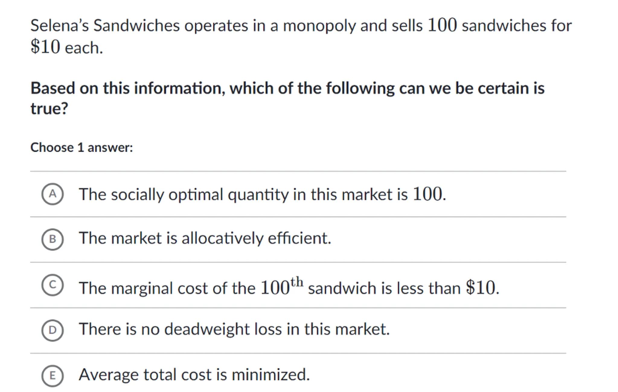 Selena's Sandwiches operates in a monopoly and sells 100 sandwiches for each.